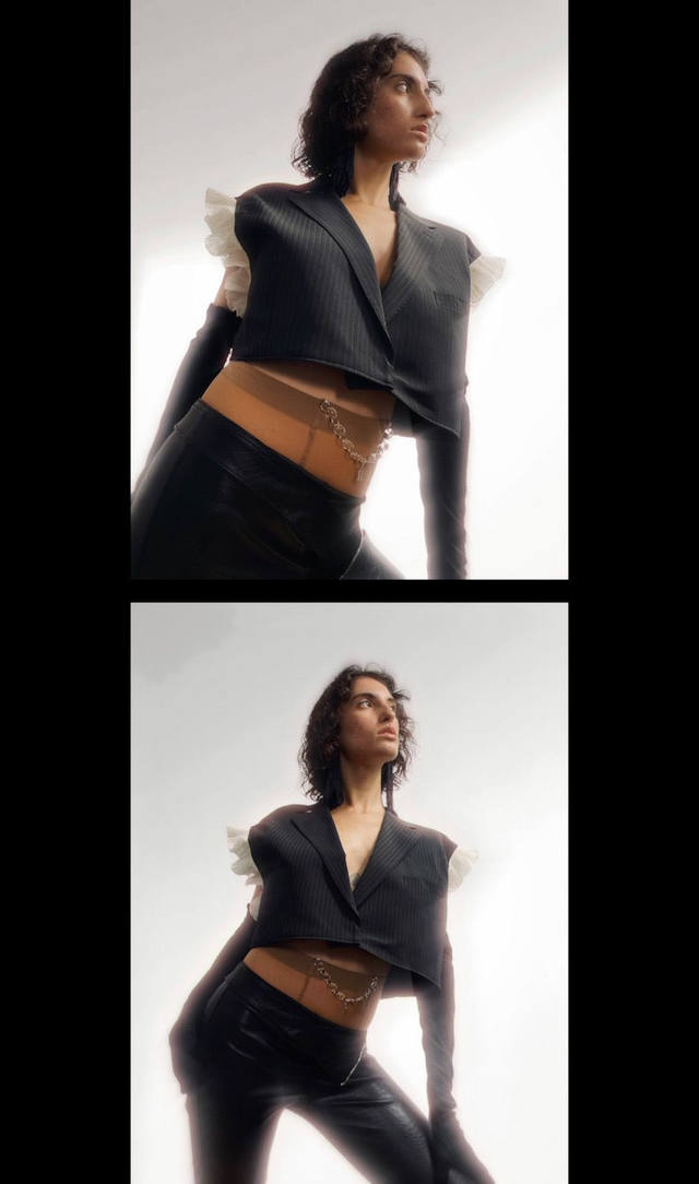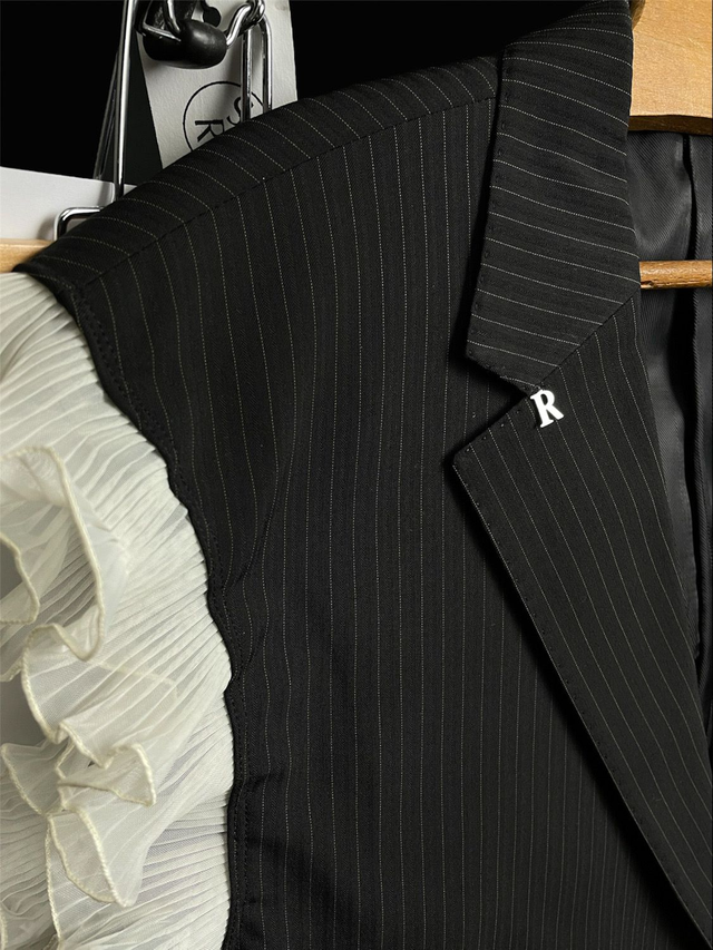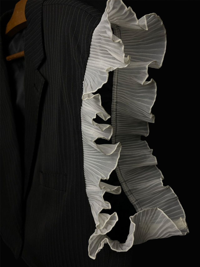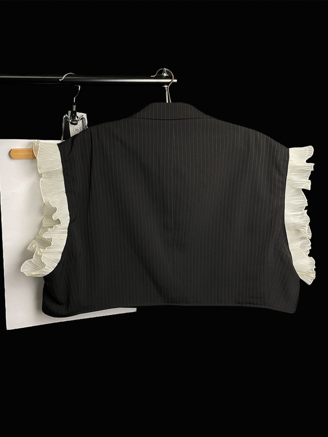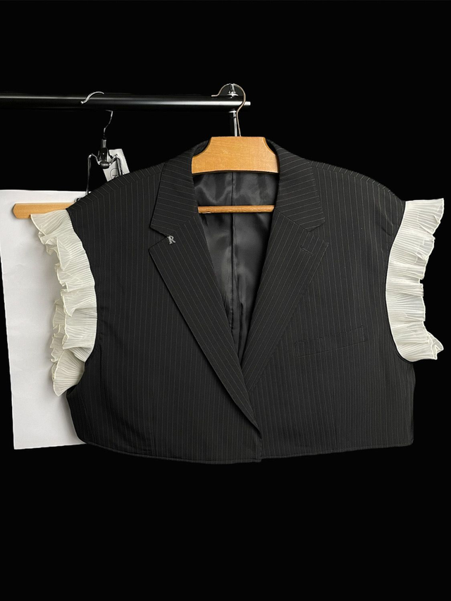 Blazer court, de seconde main et upcycled sans manches avec détails en dentelle d’organza plissée. Modèle unique (unisexe).