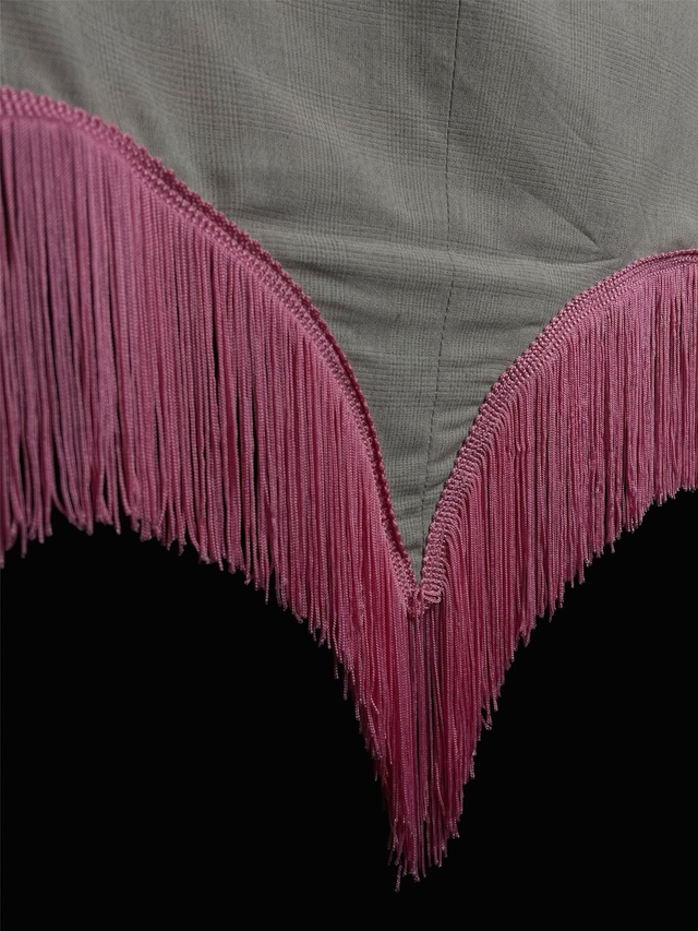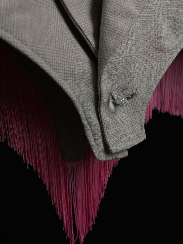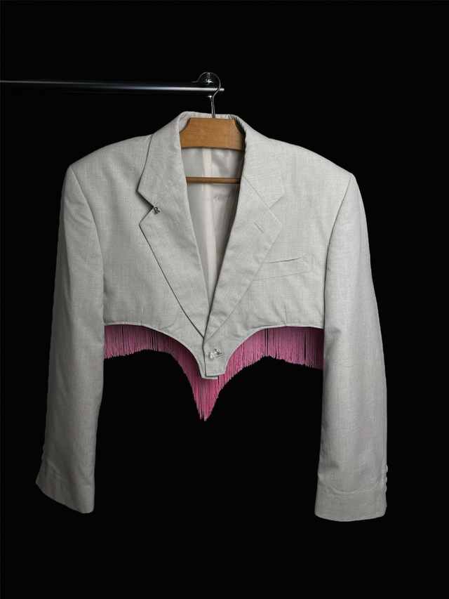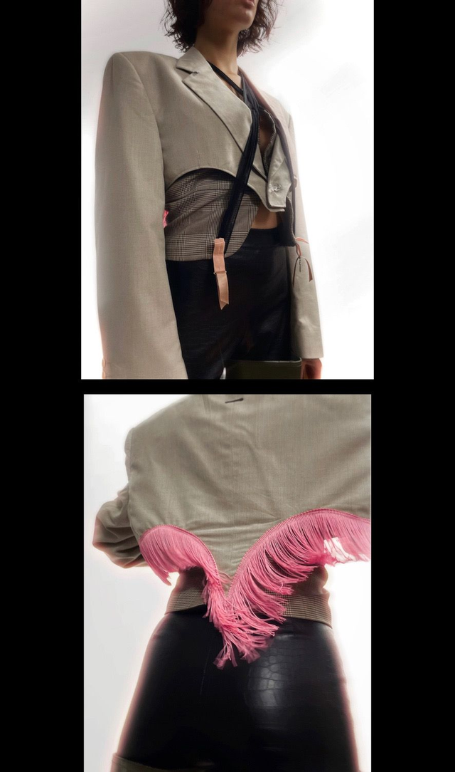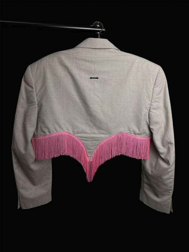 Blazer court, de seconde main et upcycled avec détails de franges dans le dos. Modèle unique (unisexe).