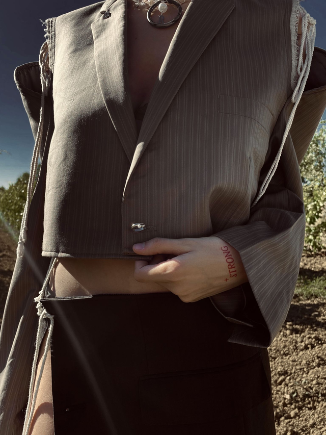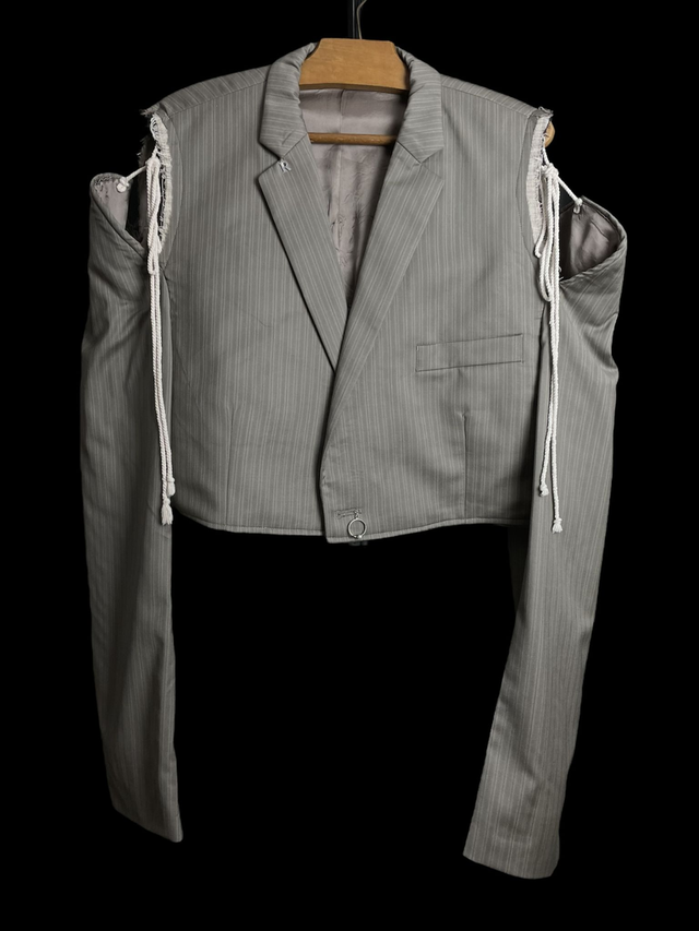 Blazer court de seconde main et upcycled avec détails de cordelettes et "déchirures".