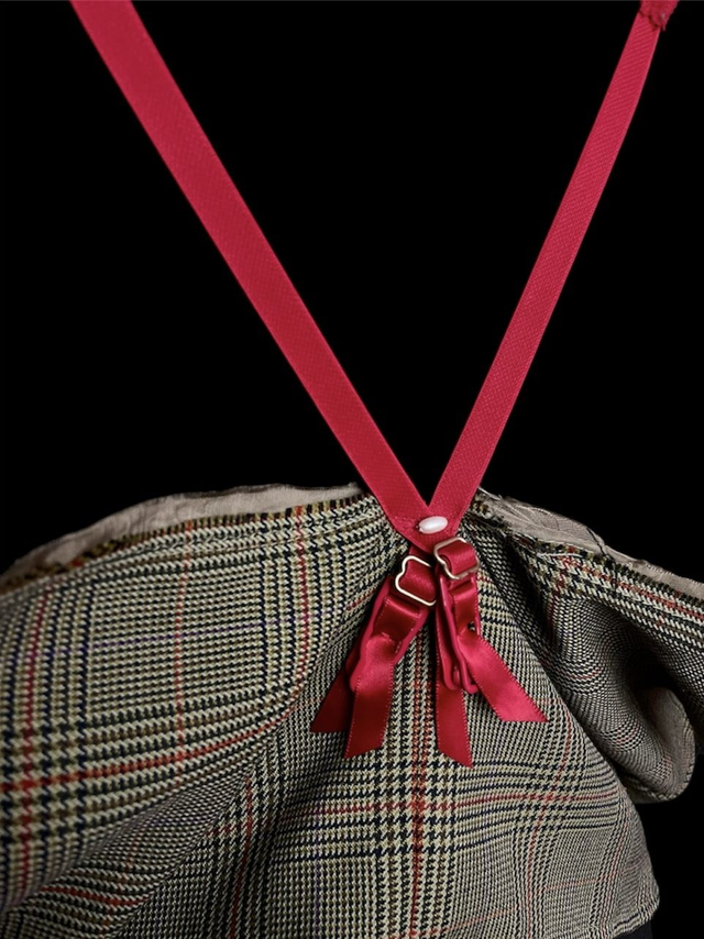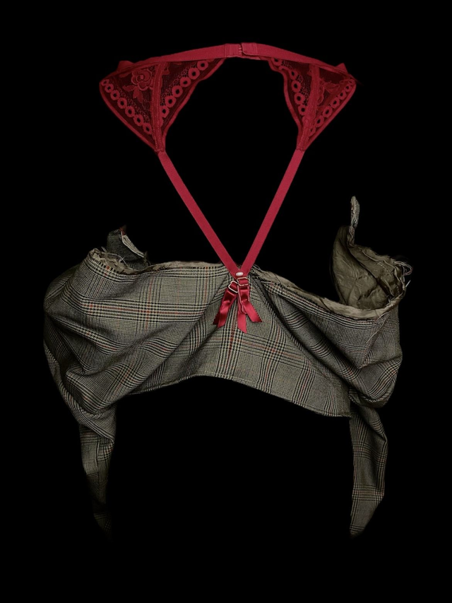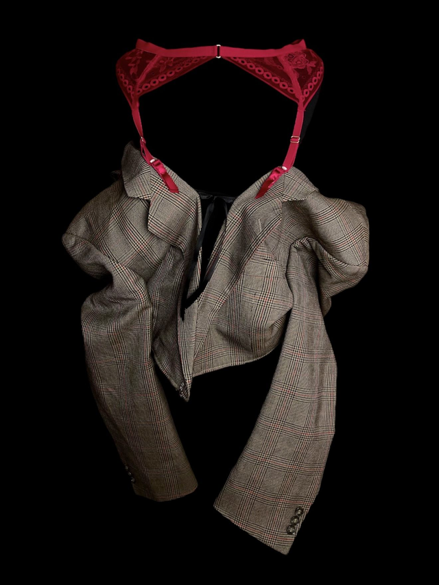 Blazer court, de seconde main et upcycled avec détails de porte-jarretelles. Modèle unique (unisexe).