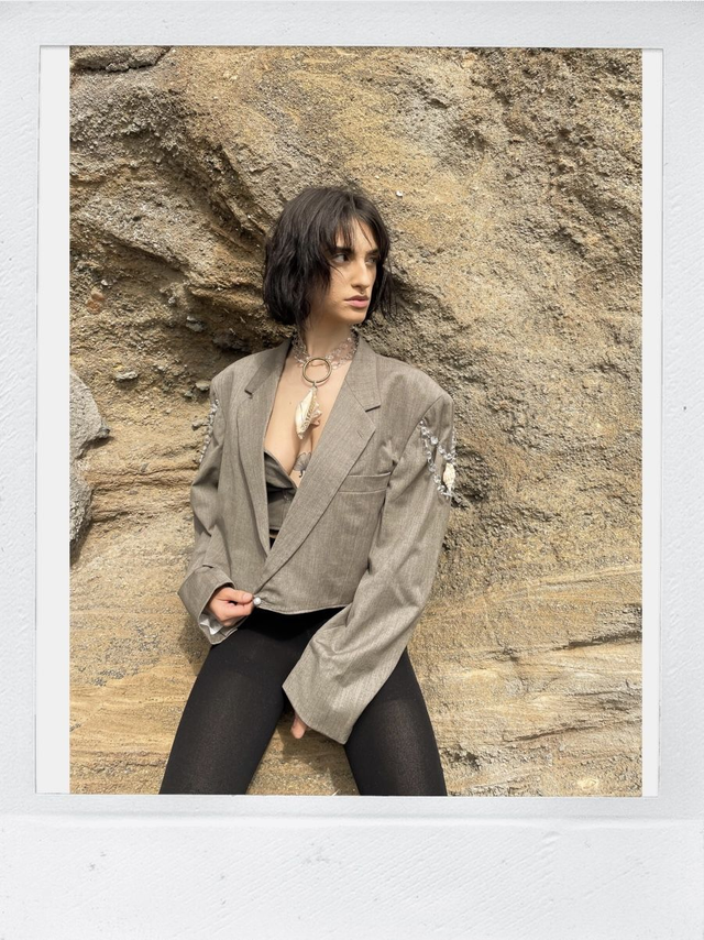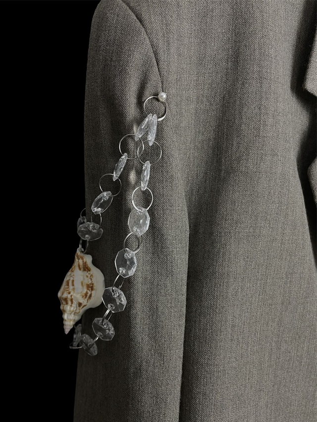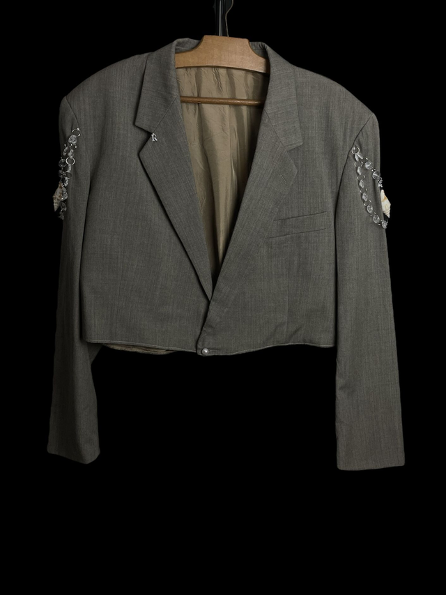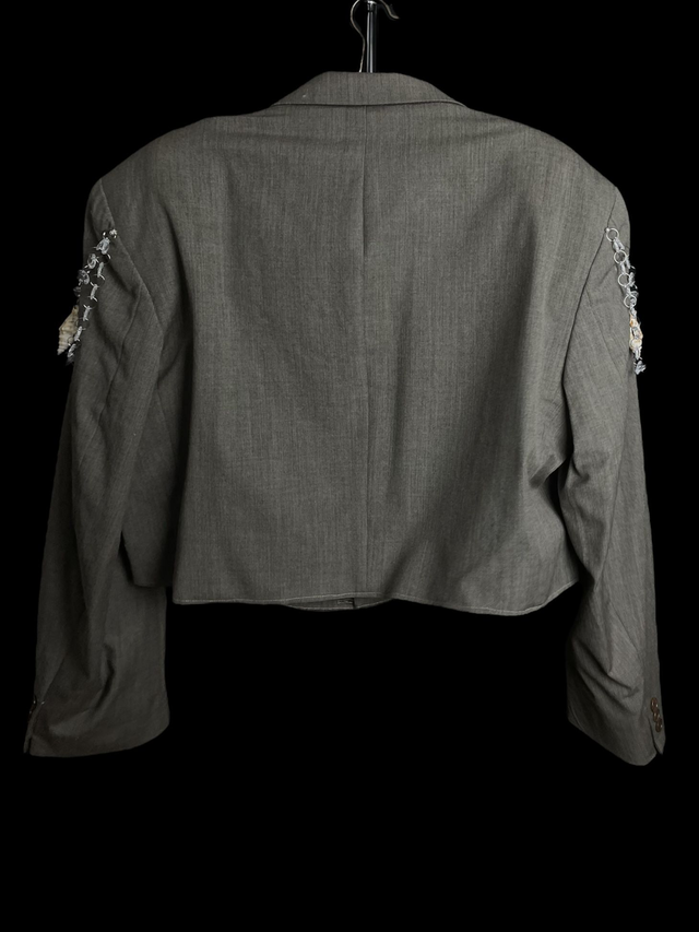 Blazer court de seconde main et upcycled avec détail coquillages et pampilles.