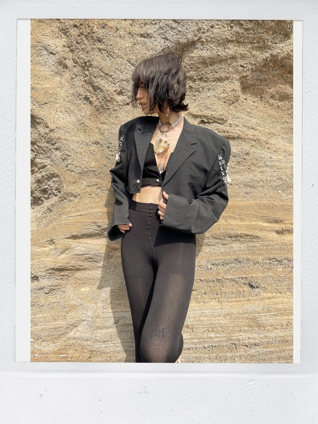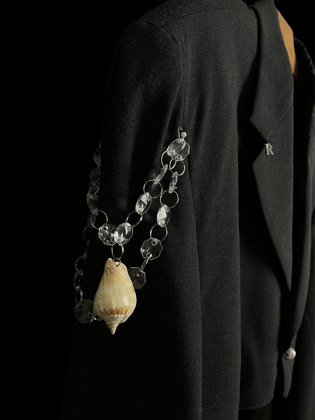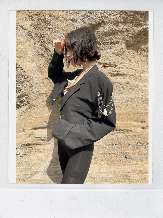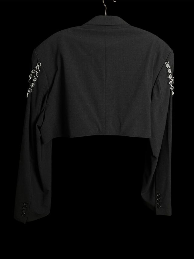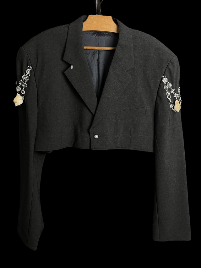 Blazer court de seconde main et upcycled avec détail coquillages et pampilles.