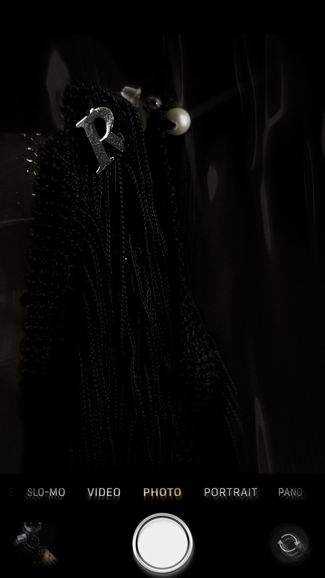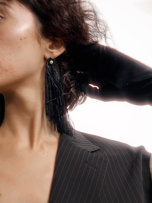 Boucles d’oreilles chutes de franges noires avec détails de perles et de l’emblématique « R ».