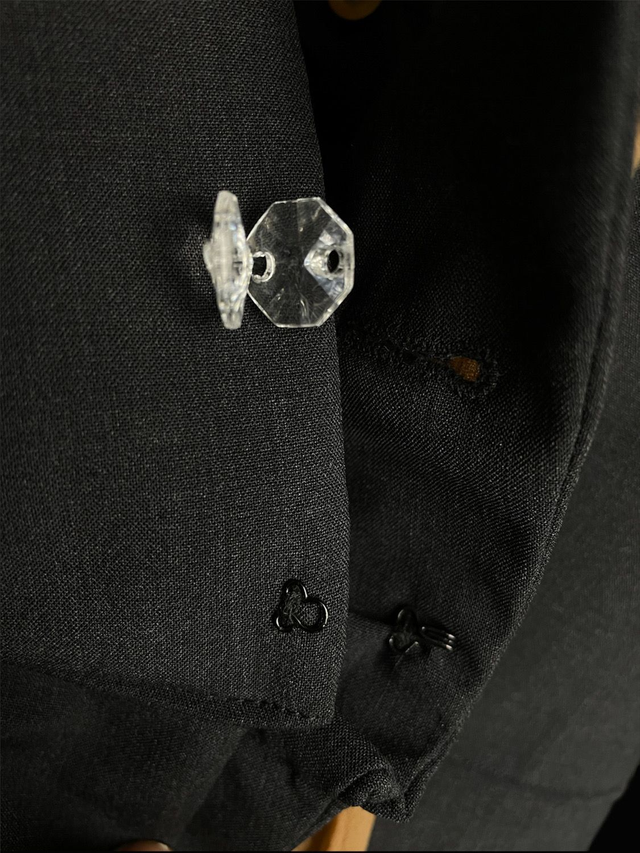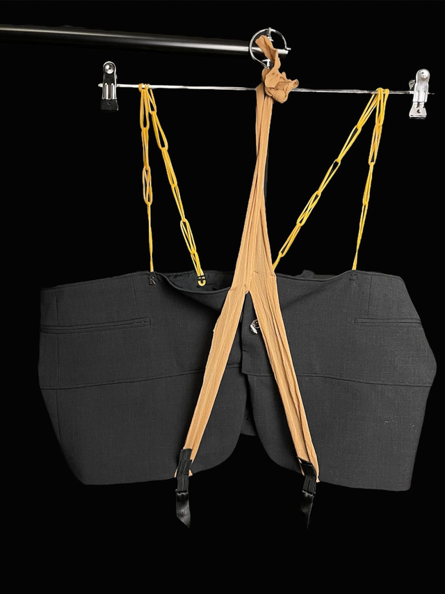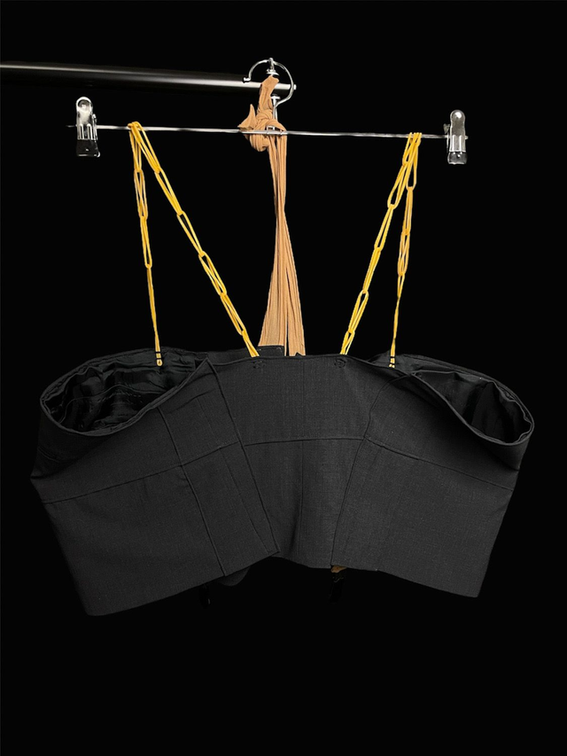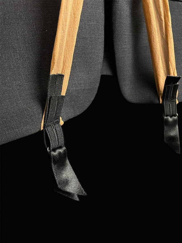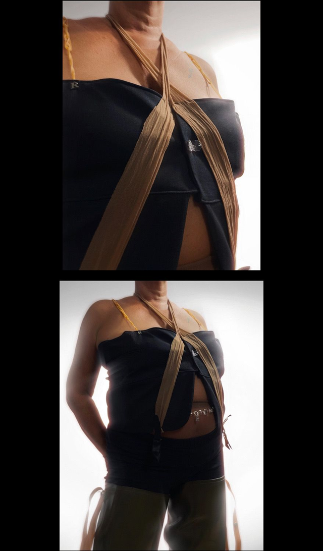 Bustier court upcycled à partir d’un bas de blazer avec détails collants upcycled beiges et attaches-jarretelles noirs. Modèle unique (unisexe).