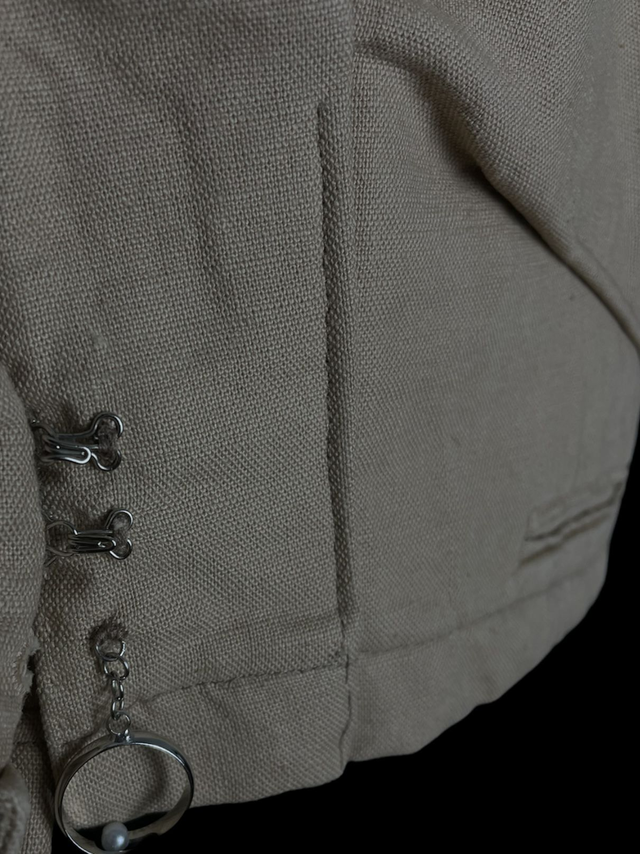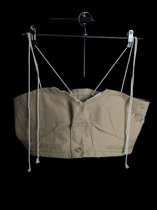 Bustier court upcycled à partir d’un bas de blazer avec détails de cordelettes et "déchirures". Modèle unique (unisexe).