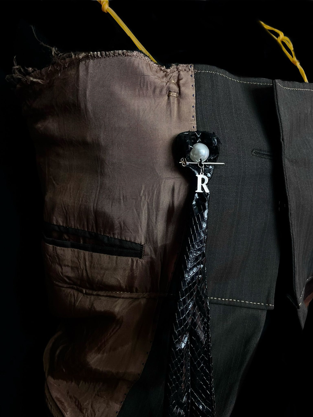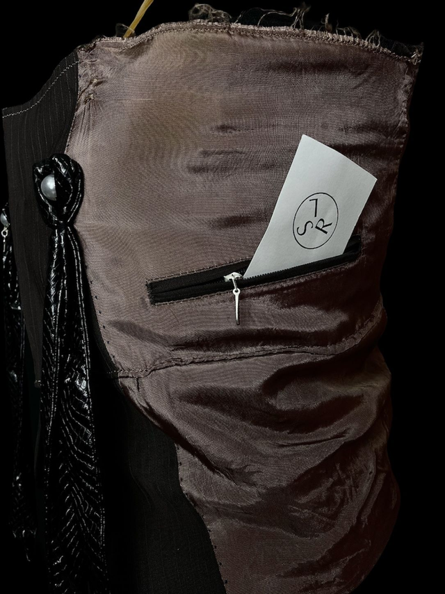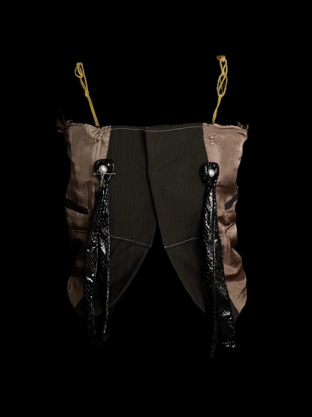 Bustier court upcycled à partir d’un bas de blazer avec détails aux tétons de rubans de simili cuir, de perles blanches et d’une aiguille cassée de machine à coudre (aiguilles cassées par la créatrice au début de son apprentissage, en tant qu’auto-didacte, de la couture à la machine donnant ainsi naissance à RLS) . Modèle unique (unisexe).