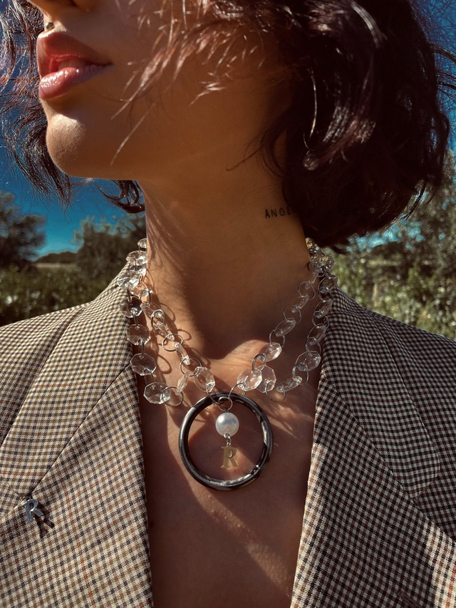Collier pampilles, anneau de rideaux upcycled et perle blanche au centre. Unisexe.