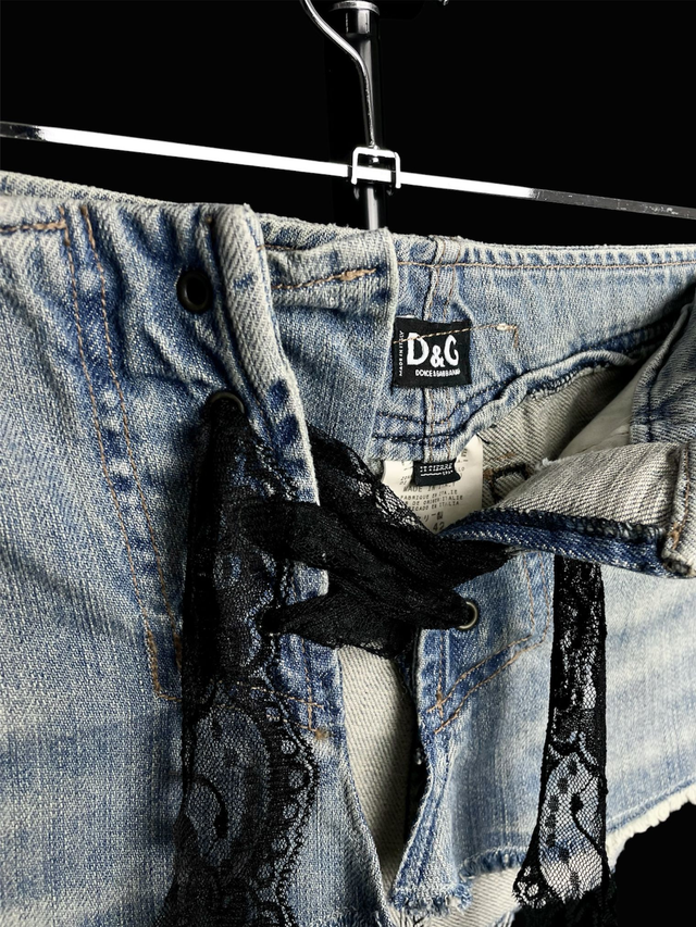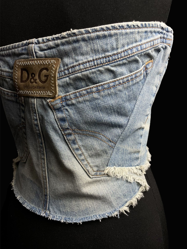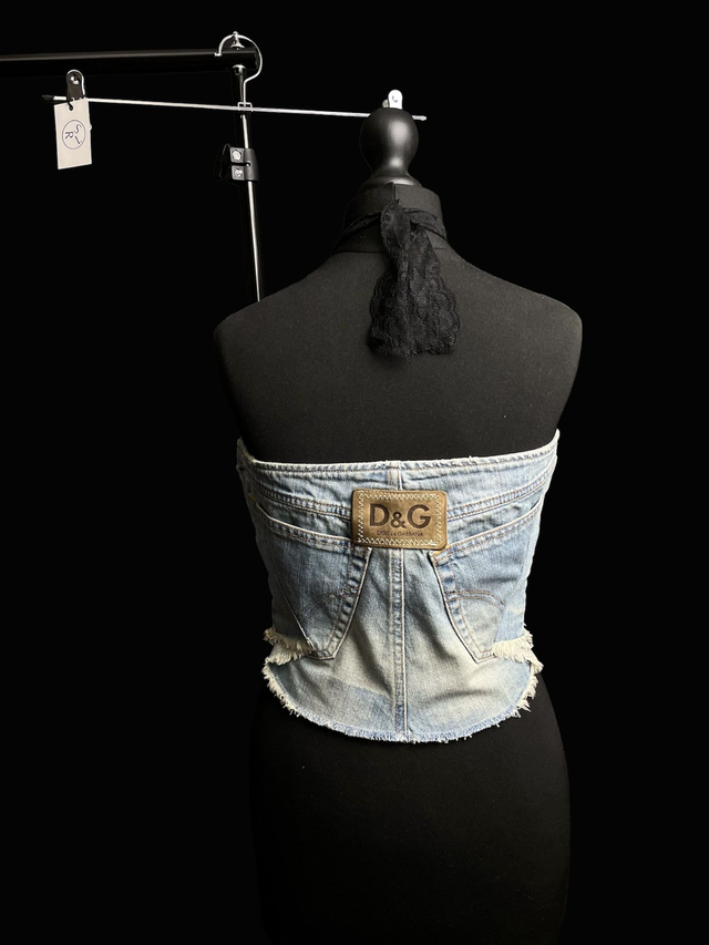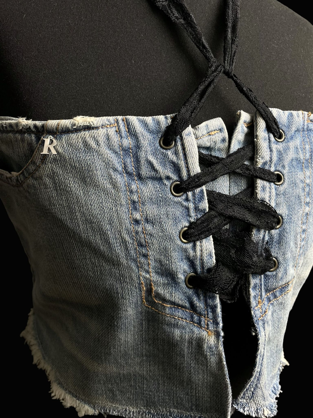 Bustier upcycled à partir d’un short en jean D&G avec un ruban de dentelle noire sur le devant.