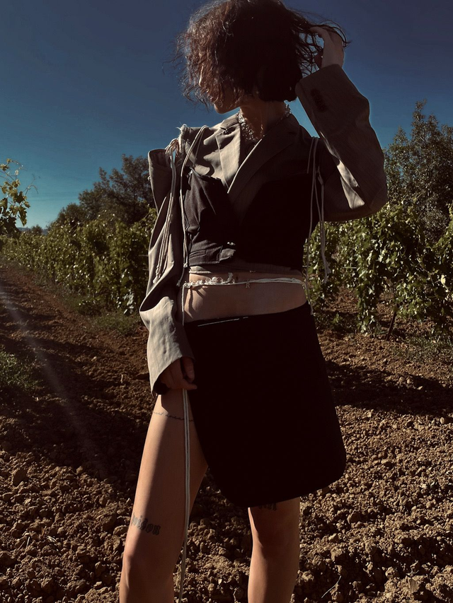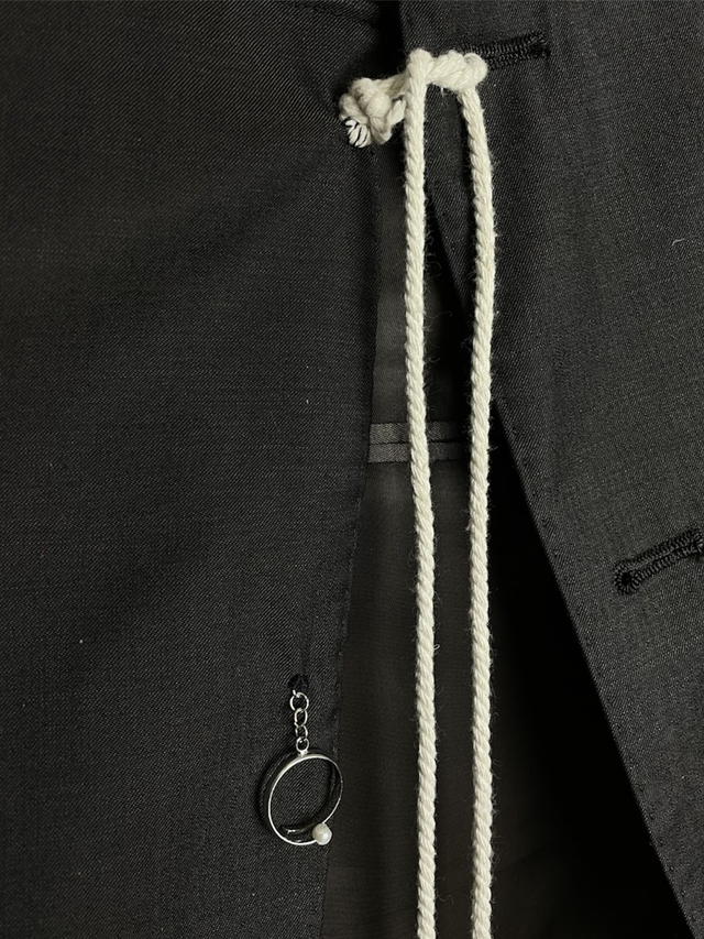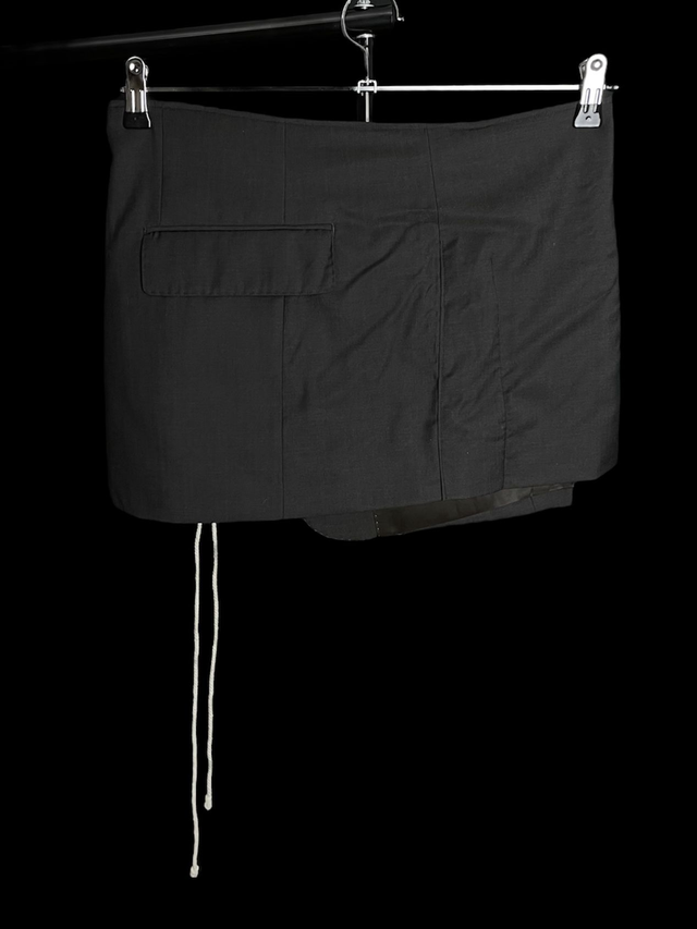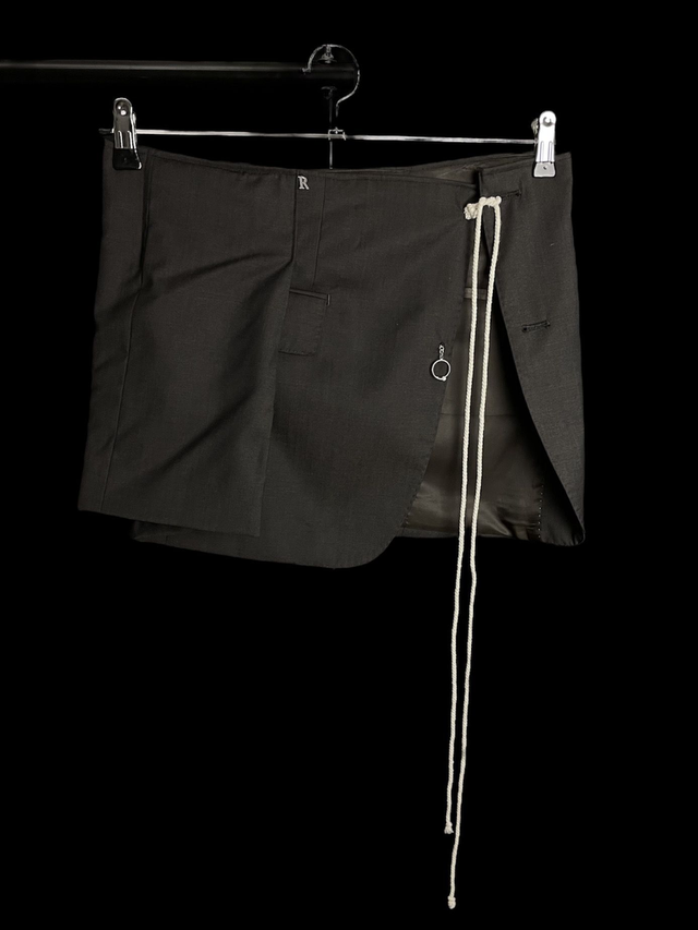 Jupe/paréo upcycled à partir d’un bas de blazer avec détails de cordelette et anneau. Modèle unique (unisexe).