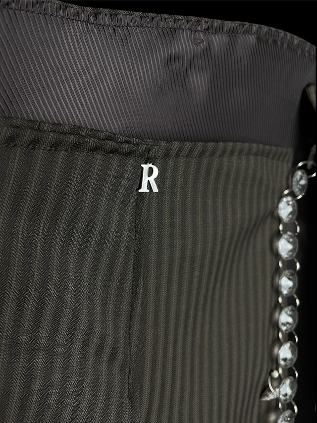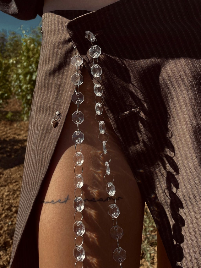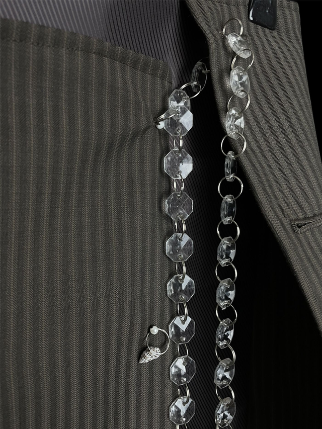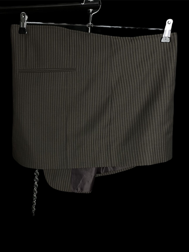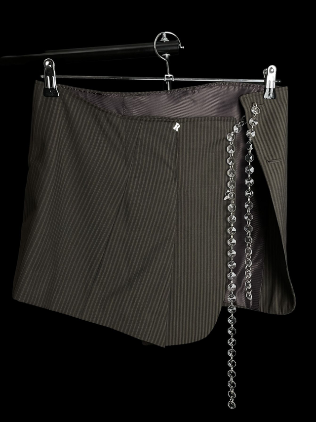 Jupe/paréo upcycled à partir d’un bas de blazer avec détails de chaîne en pampilles et mini coquillage. Modèle unique (unisexe).